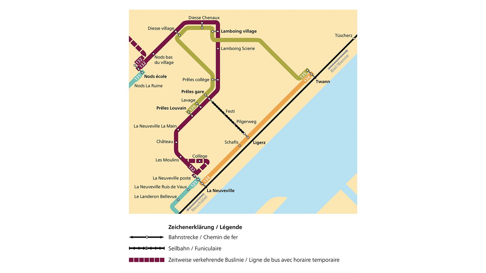 Die neue PostAuto-Linie 135 ersetzt die nicht mehr optimalen Anschlüsse mit der Linie 132 vom Plateau de Diesse via Prêles, vinifuni und Ligerz nach Biel/Bienne. Sie wird als Übergangslösung bis zur Eröffnung des Ligerztunnels im Jahr 2029 betrieben. Der Busfahrplan ist auf die Anschlüsse der Regionalzüge Richtung Biel/Bienne und Neuchâtel in Twann ausgerichtet.