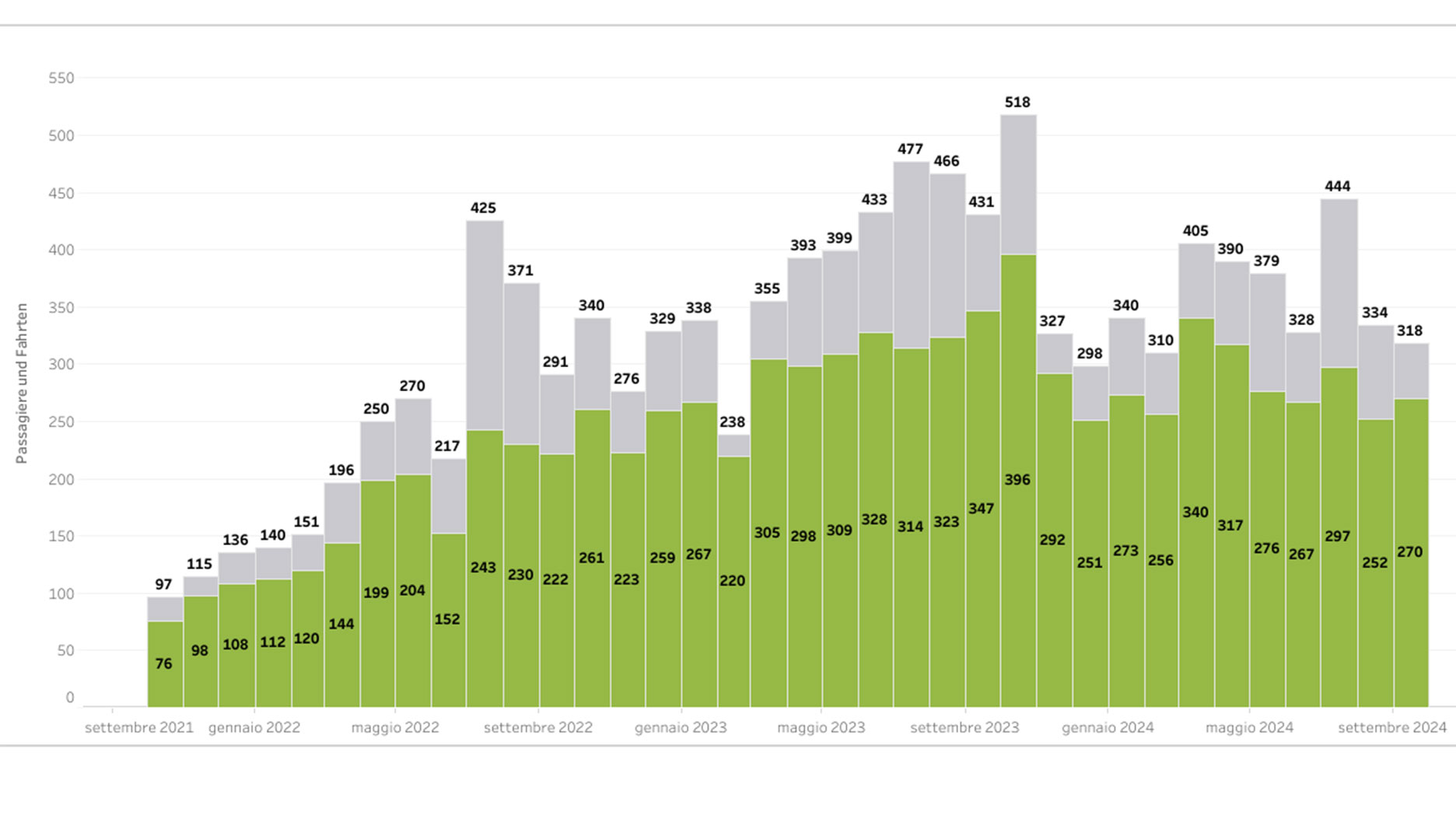 Die Anzahl Kurse (grün) und Fahrgäste (grau) ist bis Ende Oktober 2023 stetig gestiegen und hat sich 2024 stabilisiert.