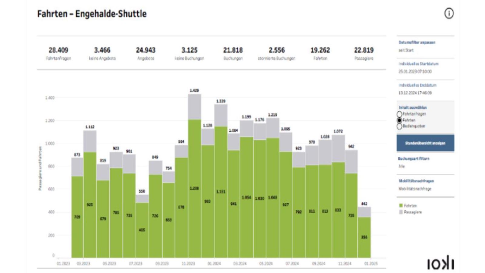Overall demand was good: from the start on 1 February 2023 to the end of the project on 15 December 2024, a total of 19,262 journeys were recorded with 22,819 passengers. This period spanned 474 operating days, with an average of 41 journeys with 48 passengers per operating day. As expected, demand varied depending on the season: as soon as it got cooler and rainy/wintry, demand increased.