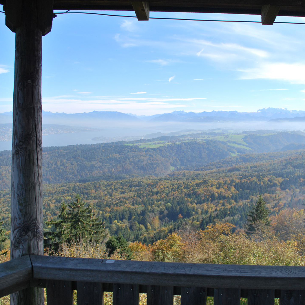 Not quite above the clouds, but above the treetops: the platform of the Albis-Hochwacht towerTarget not accessible is high above the surrounding trees, giving you a 360° panoramic view. From Zurich, the view stretches across Lake Zurich to Tödi, Rigi, Lake Zug and Pilatus, Uetliberg and back to the city.