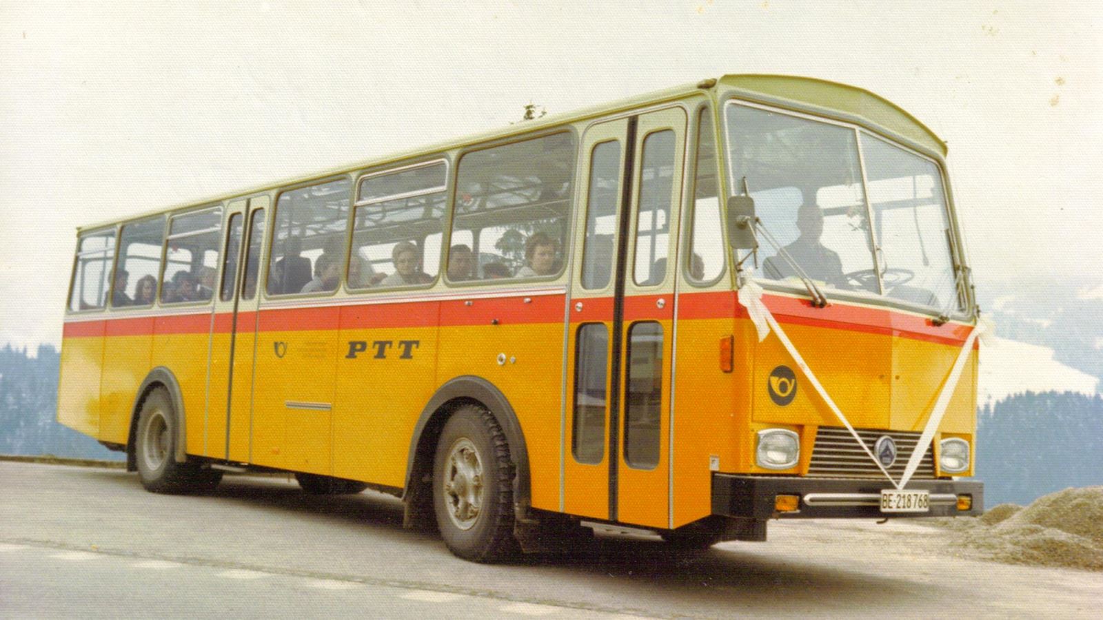 All Postbuses and stops are decorated in Swiss Post yellow with a red bar. The post horn symbol remains highly recognizable to this day.